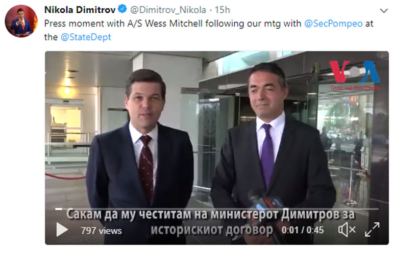 Σύμφωνα με την ανακοίνωση του Στέιτ Ντιπάρτμεντ κατά τη συνάντηση με τον ομόλογό του Νικολά Ντιμιτρόφ, ο Μ. Πομπέο τον συνεχάρη για την «ιστορική συμφωνία των Πρεσπών ανάμεσα στη «’Μακεδονία’» και την Ελλάδα».