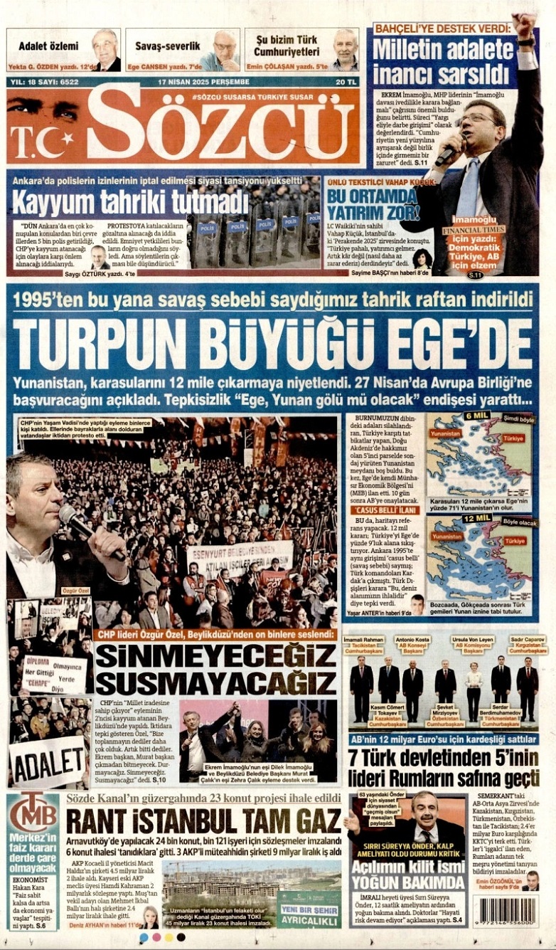 Σήμερα σύσσωμος ο Τουρκικός Τύπος ασχολείται με το θέμα και ανεβάζει τους τόνους, με απόκορύφωμα το δημοσίευμα στην τουρκική εφημερίδα Sozcu, που μιλάει για «κίνδυνο να γίνει το Αιγαίο ελληνική λίμνη», σημειώνοντας ότι «η Ελλάδα θα υποβάλει στην Ευρωπαϊκή Επιτροπή το χάρτη μέγιστης θαλάσσιας δικαιοδοσίας της, στον οποίο δείχνει χωρικά ύδατα 12 μιλίων και Αποκλειστική Οικονομική Ζώνη (ΑΟΖ)».