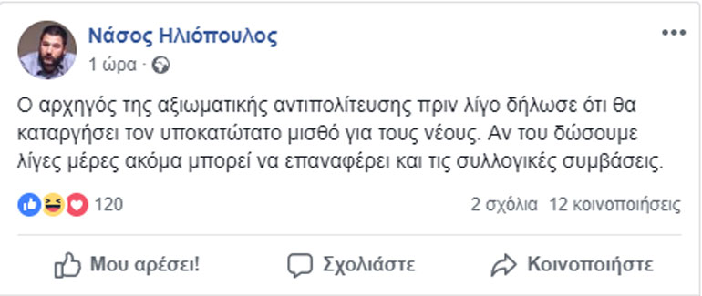 «Αν του δώσουμε λίγες μέρες ακόμα μπορεί να επαναφέρει και τις συλλογικές συμβάσεις» σχολίασε ο υφυπουργός Εργασίας Νάσος Ηλιόπουλος στο facebook τις δηλώσεις του προέδρου της ΝΔ Κ. Μητσοτάκη από την Κόρινθο ότι θα καταργήσει τον λεγόμενο υποκατώτατο μισθό για τους νέους.