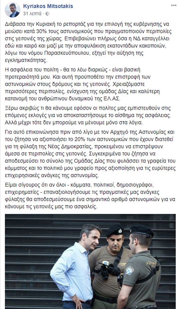 Επίσης, αναφέρει ότι για αυτό επικοινώνησε με τον αρχηγό της Αστυνομίας και του ζήτησε να αξιοποιήσει το 20% των αστυνομικών που έχουν διατεθεί για τη φύλαξη της Νέας Δημοκρατίας, προκειμένου να επιστρέψουν άμεσα σε περιπολίες στις γειτονιές.