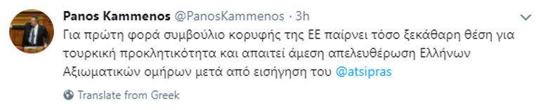 Με ανάρτησή του στον προσωπικό του λογαριασμό στο Twitter ο υπουργός Εθνικής Άμυνας Πάνος Καμμένος σχολίασε το κείμενο συμπερασμάτων του Ευρωπαϊκού Συμβουλίου για την τουρκική προκλητικότητα και το θέμα των δύο Ελλήνων στρατιωτικών που κρατούνται στις φυλακές της Αδριανούπολης.