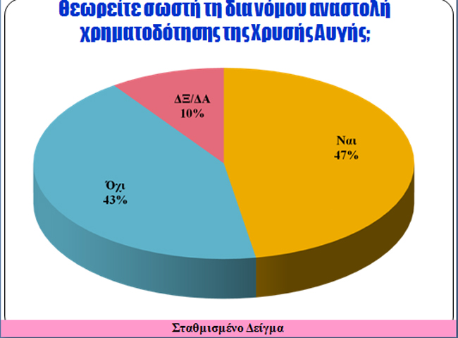 Το πρώτο ερώτημα στο οποίο κλήθηκαν να απαντήσουν οι συμμετέχοντες στην ψηφοφορία αφορούσε στην απόφαση της Βουλής να υπάρξει δια νόμου αναστολή της χρηματοδότησης της Χρυσής Αυγής. Το 47% απάντησε ότι ήταν σωστή η απόφαση, το 43% λανθασμένη, ενώ το 10% «δεν είχε γνώμη».