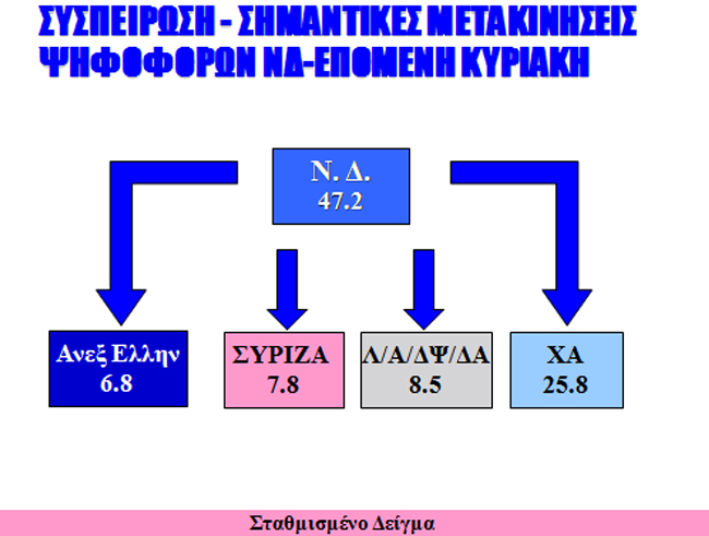 Στις συσπειρώσεις των δύο πρώτων κομμάτων η Νέα Δημοκρατία συγκεντρώνει αυτή τη στιγμή ποσοστό της τάξης του 47,2% με βασική «αιμορραγία» την διαρροή ψηφοφόρων της προς την Χρυσή Αυγή με ποσοστό μάλιστα που ανέρχεται στο 25,8%.