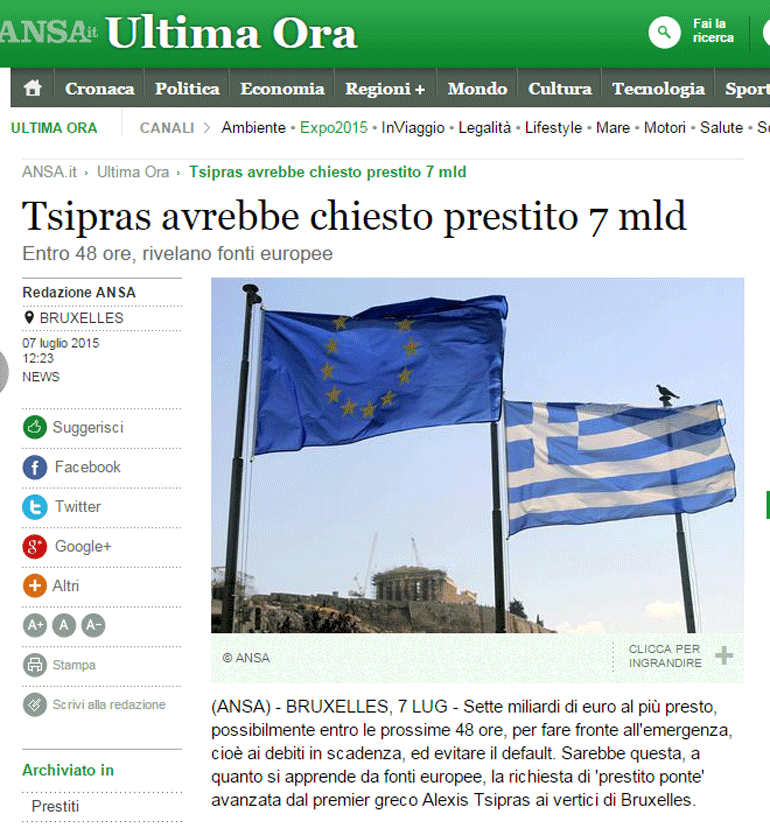 Ο Αλέξης Τσίπρας ζητεί επειγόντως 7 δισ. ευρώ για να γλιτώσει την χρεοκοπία σε μία συμφωνία-γέφυρα αποκαλύπτει το ιταλικό πρακτορείο ANSA, ενώ την ελληνική πρόταση με την οποία πάει σήμερα σε Eurogroup και Σύνοδο Κορυφής η Αθήνα παρουσιάζει η γερμανική εφημερίδα Suddeutsche Zeitung.