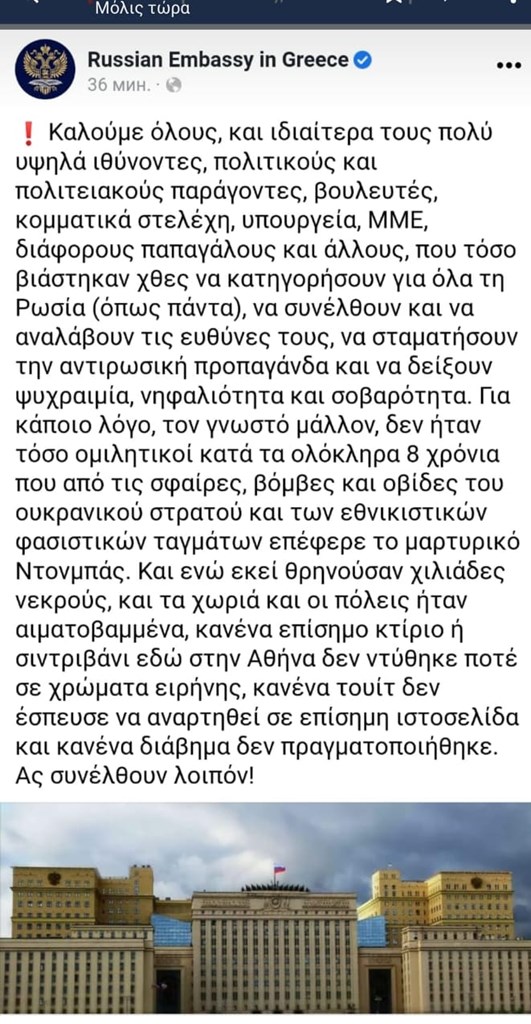 Δείτε την ανακοίνωση της πρεσβείας της Ρωσίας και την ανάρτηση του υπουργείου Άμυνας.