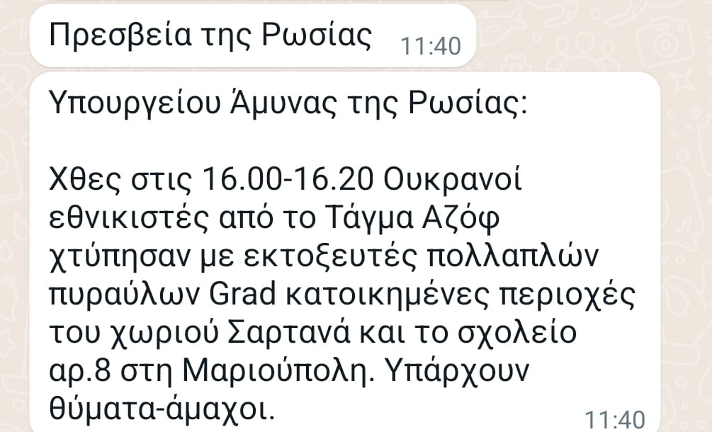 Με μια ευθεία επίθεση σε «πολύ υψηλά ιθύνοντες πολιτικούς και πολιτειακούς παράγοντες, βουλευτές, κομματικά στελέχη, υπουργεία, ΜΜΕ και διάφορους παπαγάλους» η πρεσβεία της Ρωσίας στην Αθήνα επανέρχεται στο θέμα των νεκρών ομογενών στο χωριό Σαρτανά έξω από τη Μαριούπολη και με μια ανάρτηση του υπουργείου Άμυνας της Ρωσίας υποστηρίζει πως τα χτυπήματα στο χωριό και οι νεκροί ομογενείς είναι αποτέλεσμα επίθεση Ουκρανών εθνικιστών από το Τάγμα Αζόφ.