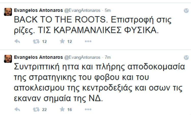 Επιστροφή στις… καραμανλικές ρίζες της Νέας Δημοκρατίας προτείνει ο Ευάγγελος Αντώναρος, ο οποίος αποδίδει τη «συντριπτική ήττα» του κόμματος στην πλήρη αποδοκιμασία της στρατηγικής του φόβου και του αποκλεισμού της κεντροδεξιάς.