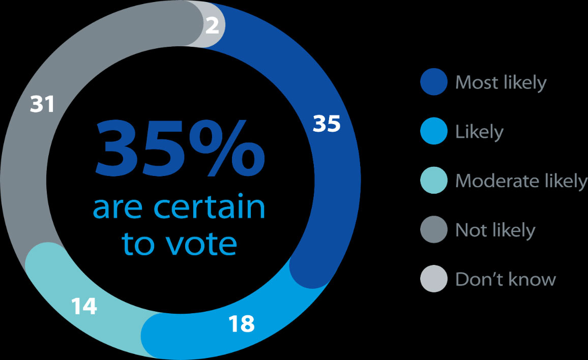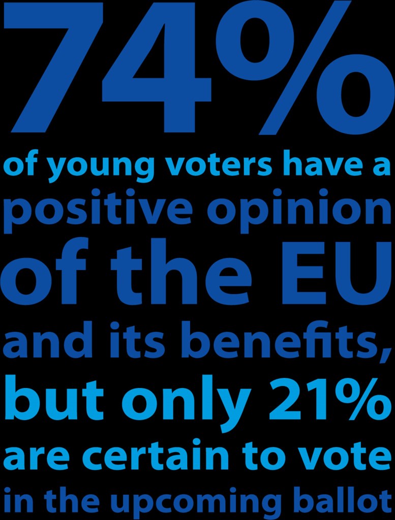 Για τους νέους που έχουν δικαίωμα ψήφου, παρόλο που έχουν σταθερά την πιο θετική στάση απέναντι στην Ε.Ε. (74%), μόλις το 21% είναι βέβαιο ότι θα ψηφίσει, ενώ το 34% παραμένει αναποφάσιστο.
