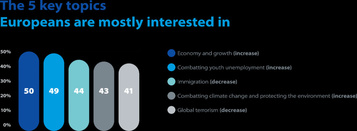 Παράλληλα, εξωτερικές πιέσεις από τρίτες χώρες καταδεικνύουν ότι οι χώρες της Ε.Ε. πρέπει να συνεργαστούν ακόμα πιο στενά ώστε να διατηρήσουν την επιρροή και το ειδικό βάρος τους στη νέα παγκόσμια πραγματικότητα. Η ίδια έκθεση του εαρινού Ευρωβαρόμετρου δείχνει ότι οι πολίτες ενδιαφέρονται περισσότερο για την κατάσταση της οικονομίας, τις προοπτικές απασχόλησης, τη μετανάστευση, την κλιματική αλλαγή και τη μάχη εναντίον της τρομοκρατίας, θέματα που τονίζουν την ανάγκη για περισσότερη ενότητα, συνεργασία και κοινή δράση.