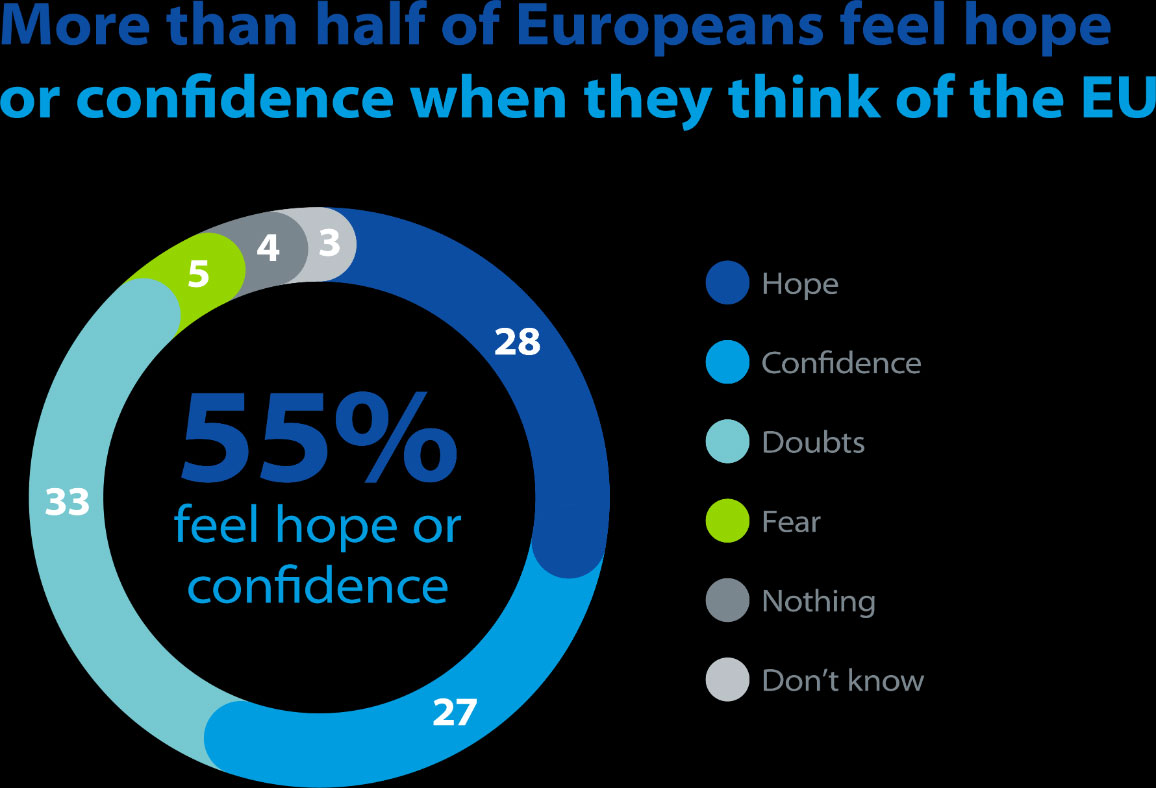 Οι συνεχιζόμενες διαπραγματεύσεις για το Brexit έχουν καταδείξει τις αβεβαιότητες που γεννά η διάσπαση και τους κινδύνους που ενέχει η αποχώρηση από την προστασία της Ε.Ε. Όταν ρωτήθηκαν ποια συναισθήματα τους έρχονται πρώτα στο μυαλό όταν σκέφτονται την Ε.Ε., οι περισσότεροι Ευρωπαίοι απάντησαν ότι αισθάνονται ελπίδα και εμπιστοσύνη (55% συνολικά) – ενώ η αβεβαιότητα για το μέλλον της Ευρώπης προκαλεί αμφιβολία ως το κύριο συναίσθημα για έναν στους τρεις Ευρωπαίους που συμμετείχαν στην έρευνα.