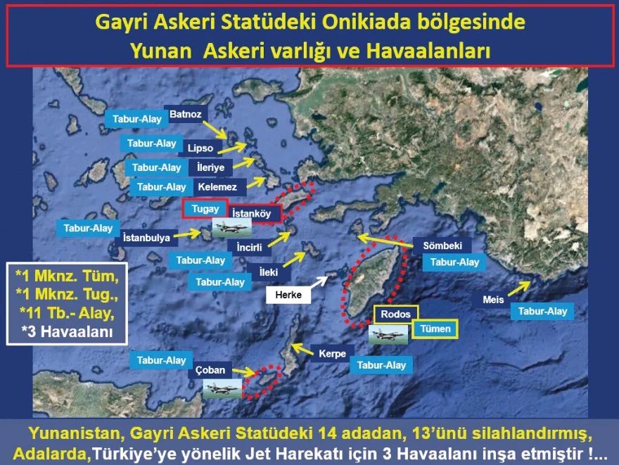 Σύμφωνα με τη Yeni Safak, 22 από τα 23 νησιά είναι στρατιωτικοποιημένα και καθιστούν «απειλή για την Τουρκία», ενώ μονάχα η Χάλκη είναι αποστρατιωτικοποιημένη. Επιπλέον, το ίδιο δημοσίευμα αναφέρει πως η Τουρκία έχει την κυριαρχία εννιά νησιών (όπως η Λήμνος, η Λέσβος, η Σάμος, η Χίος, η Ικαρία και η Ρόδος) και πως στην Ελλάδα έχει παραχωρηθεί το «δικαίωμα χρήσης».