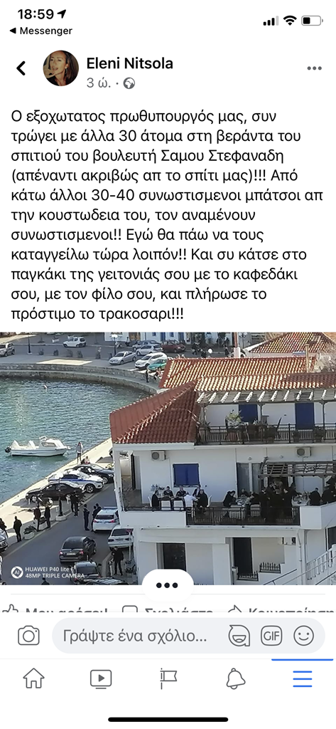Στη φωτογραφία που τραβήχτηκε από γείτονα και αναρτήθηκε στα social media, φαίνεται ο πρωθυπουργός να γευματίζει με τουλάχιστον 15 άτομα, που κάθονται σε δύο διαφορετικά τραπέζια.