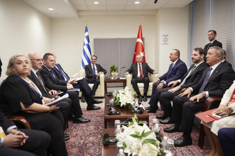 Σε θετικό κλίμα με πολλές προσωπικές αναφορές και διπλωματικού τύπου φιλοφρονήσεις κύλησε η συνάντηση Μητσοτάκη – Ερντογάν στη Νέα Υόρκη, στο περιθώριο της Γενικής Συνέλευσης του ΟΗΕ. Είναι η πρώτη φορά που ο Κυριάκος Μητσοτάκης ως πρωθυπουργός συναντάται με τον Πρόεδρο της Τουρκίας.