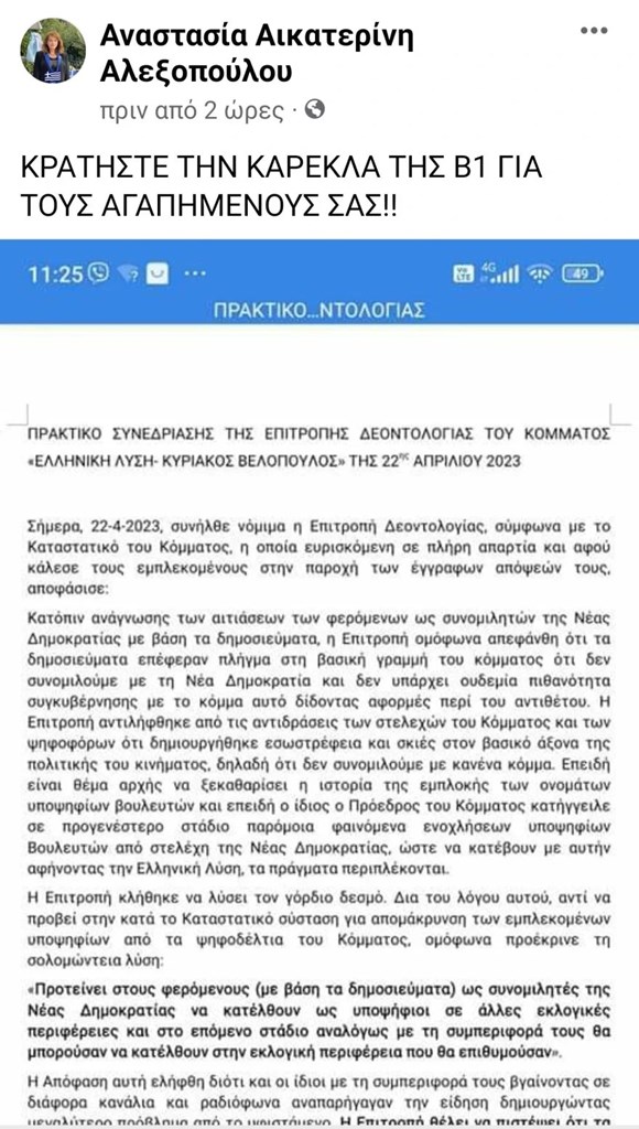 Από την πλευρά της, η κυρία Αναστασία-Αικατερίνη Αλεξοπούλου δημοσίευσε αρχικά στον προσωπικό της λογαριασμό στο Facebook την απόφαση της Επιτροπής Δεοντολογίας της Ελληνικής Λύσης, ενώ στη συνέχεια πρόσθεσε το προσωπικό της σχόλιο: «ΚΡΑΤΗΣΤΕ ΤΗΝ ΚΑΡΕΚΛΑ ΤΗΣ Β1 ΓΙΑ ΤΟΥΣ ΑΓΑΠΗΜΕΝΟΥΣ ΣΑΣ!!».