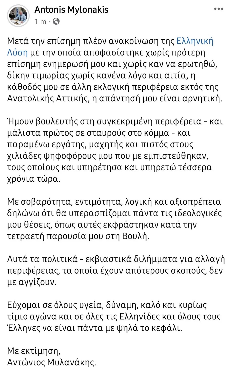 Λίγη ώρα μετά την ανακοίνωση της απόφασης της επιτροπής δεοντολογίας της «Ελληνικής Λύσης», ο κ. Μυλωνάκης σε ανάρτησή του έγραψε «η απάντηση μου είναι αρνητική».