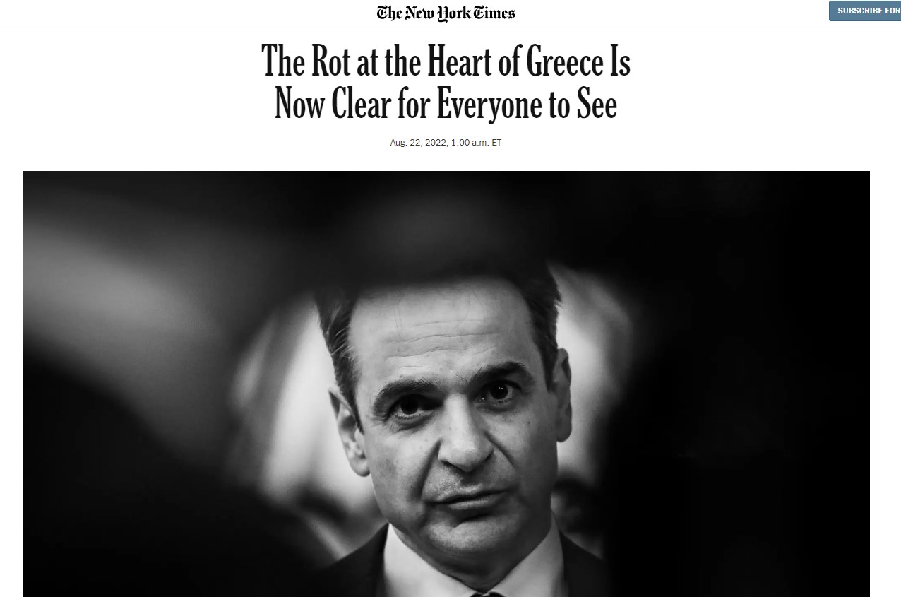 Στο άρθρο που δημοσιεύουν οι New York Times με τον τίτλο «The Rot at the Heart of Greece Is Now Clear for Everyone to See» καταλογίζονται σαφώς και ξεκάθαρα ευθύνες στον Κυριάκο Μητσοτάκη για το καθεστώς διαφθοράς και παρακολουθήσεων που έχει επιβληθεί. Ο αρθρογράφος αναφέρεται διεξοδικά στον ρόλο του Γρηγόρη Δημητριάδη, εξ απορρήτων συνεργάτη και ανιψιού του πρωθυπουργού, καθώς και στην τοποθέτηση του διοικητή της ΕΥΠ Παναγιώτη Κοντολέοντα. Γίνεται λόγος και για τις προσωπικές σχέσεις του Γρηγόρη Δημητριάδη με τον επιχειρηματία – ιδιοκτήτη της εταιρείας που εμπορεύεται σε Ελλάδα και Κύπρο το κατασκοπευτικό λογισμικό Predator.