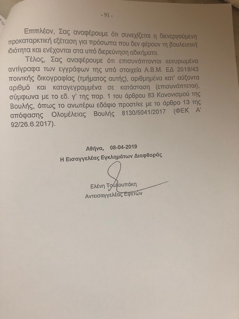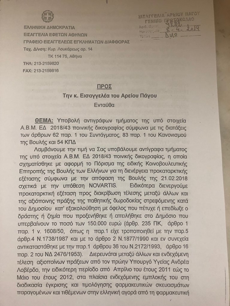 Σύμφωνα με το διαβιβαστικό έγγραφο της εισαγγελίας του Αρείου Πάγου προς τη Βουλή, ο πρώην υπουργός,