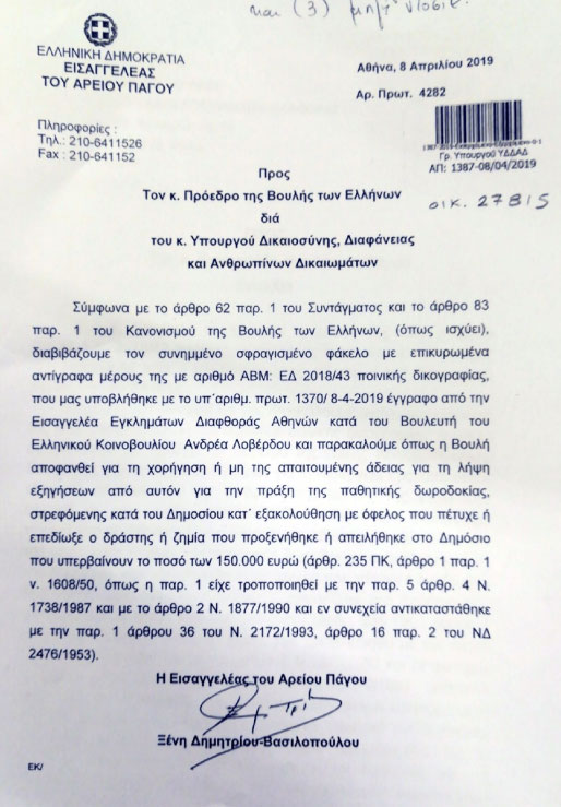 «Κατ’ ακολουθία των ανωτέρω αποδεικτικών στοιχείων, κρίνουμε αναγκαίο να κληθεί σε παροχή, χωρίς όρκο, εξηγήσεων, σύμφωνα με την διάταξη του άρθρου 31 ΚΠΔ, ο Ανδρέας Λοβέρδος», αναφέρει στο έγγραφό της η Εισαγγελία Εγκλημάτων Διαφθοράς.