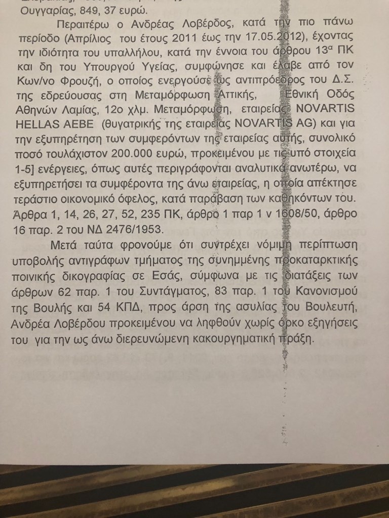 Όπως αναφέρει το διαβιβαστικό: «Ο Ανδρέας Λοβέρδος κατά την περίοδο Απρίλιος 2011-Μάιος 2012 έχοντας την ιδιότητα του υπουργού υγείας συμφώνησε και έλαβε από τον Κωσταντίνο Φρουζή ο οποίος ενεργούσε ως αντιπρόεδρος του διοικητικού συμβουλίου της Novartis συνολικό ποσό τουλάχιστον 200.000 € προκειμένου με τις υπό στοιχεία ενέργειες να εξυπηρετήσει τα συμφέροντα της εταιρείας κατά παράβαση των καθηκόντων του».