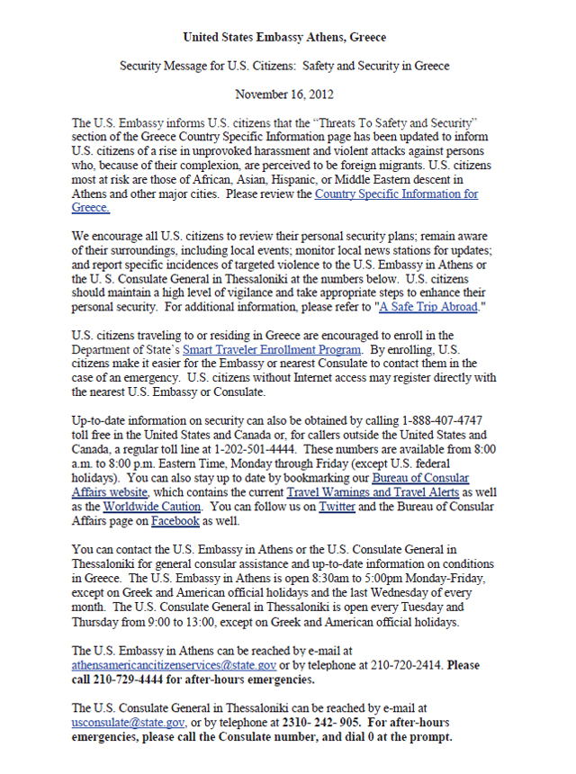 Με ανακοίνωσή της, η πρεσβεία των ΗΠΑ στην Αθήνα προειδοποιεί τους Αμερικανούς πολίτες που ζουν ή επισκέπτονται την Ελλάδα να προσέχουν, διότι υπάρχει κίνδυνος να πέσουν θύματα ρατσιστικών επιθέσεων.