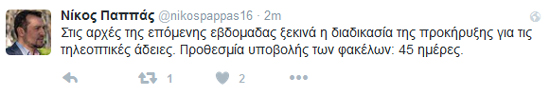 Στις αρχές της επόμενης εβδομάδας θα ξεκινήσουν οι διεργασίες προκήρυξης για τις τηλεοπτικές άδειες. Σύμφωνα με τον Νίκο Παππά, η διαδικασία θα διαρκέσει 45 ημέρες.