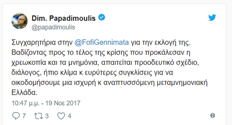 Ο κ. Παπαδημούλης σε ανάρτησή στο Twitter ανέφερε: «Συγχαρητήρια στην @FofiGennimata για την εκλογή της. Βαδίζοντας προς το τέλος της κρίσης που προκάλεσαν η χρεωκοπία και τα μνημόνια, απαιτείται προοδευτικό σχέδιο, διάλογος, ήπιο κλίμα κ ευρύτερες συγκλίσεις για να οικοδομήσουμε μια ισχυρή κ αναπτυσσόμενη μεταμνημονιακή Ελλάδα».
