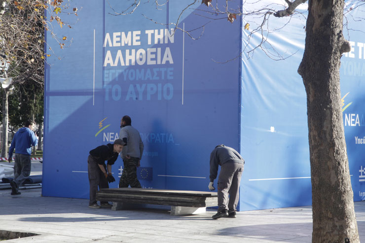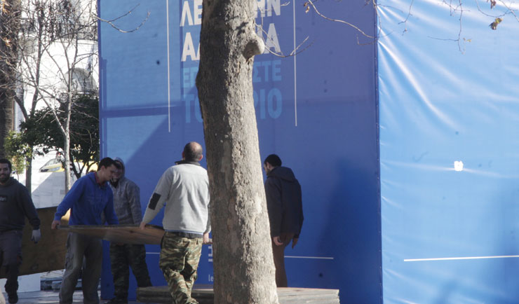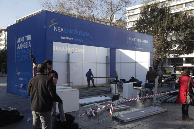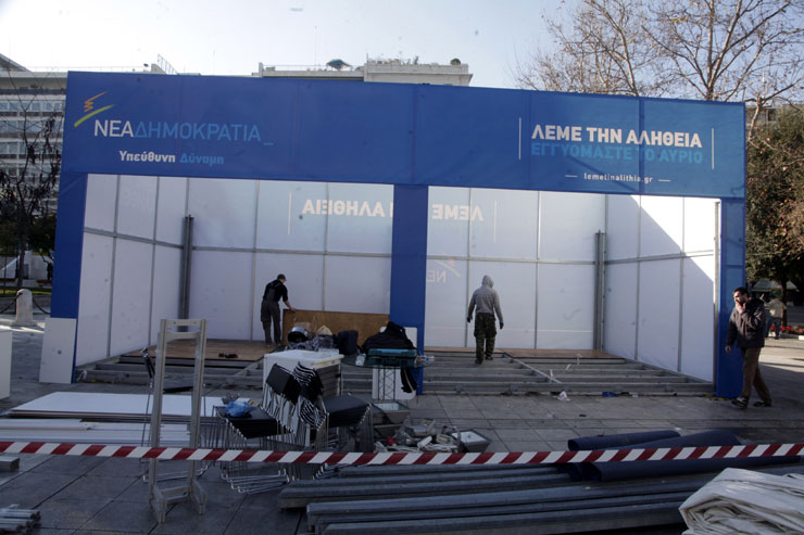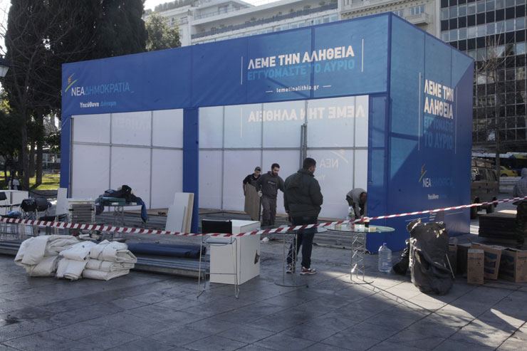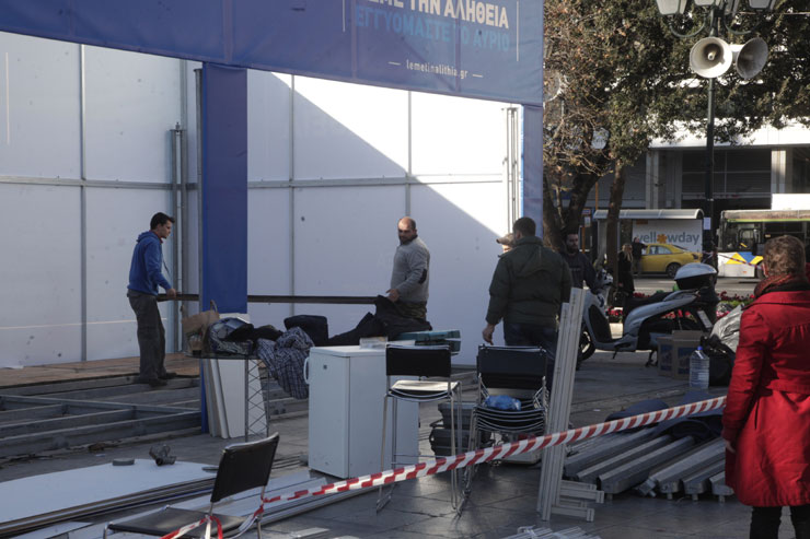 Το εκλογικό κέντρο της Νέας Δημοκρατίας δέσποζε για ημέρες στην πλατεία Συντάγματος και το πρωί της Δευτέρας συνεργείο ξεκίνησε την αποσυναρμολόγησή του.