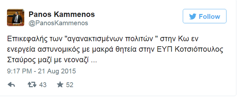 Στο μήνυμα που ανάρτησε στο twitter, ο κ. Καμμένος κατονομάζει τον αστυνομικό και συμπληρώνει πως η επίθεση έγινε «μαζί με νεοναζί».