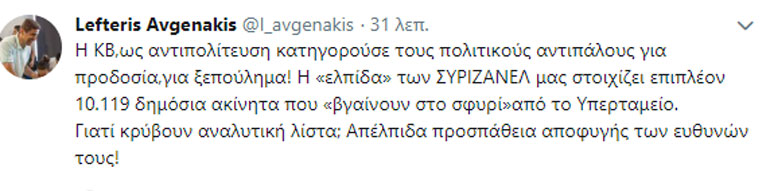 Ο γραμματέας της Πολιτικής Επιτροπής της ΝΔ, σε ανάρτησή του στο Twitter, τονίζει πως η κυβέρνηση κατηγορούσε τους πολιτικούς αντιπάλους της για προδοσία και για ξεπούλημα προσθέτοντας ότι «η “ελπίδα” των ΣΥΡΙΖΑΝΕΛ μάς στοιχίζει επιπλέον 10.119 δημόσια ακίνητα που “βγαίνουν στο σφυρί” από το Υπερταμείο. Γιατί κρύβουν αναλυτική λίστα; Απέλπιδα προσπάθεια αποφυγής των ευθυνών τους».