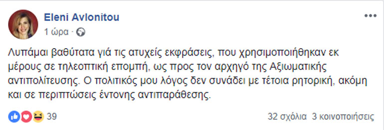 «Λυπάμαι βαθύτατα για τις ατυχείς εκφράσεις, που χρησιμοποιήθηκαν εκ μέρους μου σε τηλεοπτική εκπομπή, ως προς τον αρχηγό της Αξιωματικής Αντιπολίτευσης. Ο πολιτικός μου λόγος δεν συνάδει με τέτοια ρητορική, ακόμη και σε περιπτώσεις έντονης αντιπαράθεσης», έγραψε η κ. Αυλωνίτου.