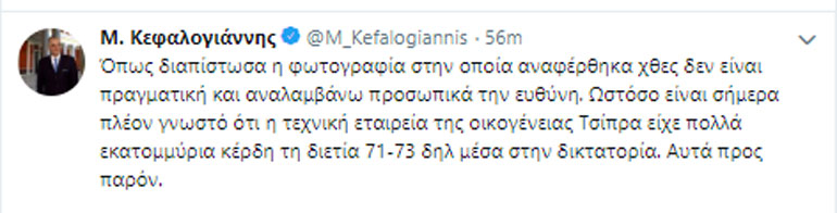 «Όπως διαπίστωσα, η φωτογραφία στην οποία αναφέρθηκα χθες δεν είναι πραγματική, και αναλαμβάνω προσωπικά την ευθύνη. Ωστόσο είναι σήμερα πλέον γνωστό, ότι η τεχνική εταιρεία της οικογένειας Τσίπρα είχε πολλά εκατομμύρια κέρδη τη διετία 71-73 δηλαδή μέσα στην δικτατορία. Αυτά προς παρόν» έγραψε σε ανάρτησή του στο Twitter ο ευρωβουλευτής της ΝΔ, Μανώλης Κεφαλογιάννης.