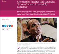 Μετά τις δηλώσεις σε γερμανικό περιοδικό περί βασανιστηρίων της τρόικας αλά… CIA, o Γιάννης Βαρουφάκης σε συνέντευξή του στην εφημερίδα Guardian αναφέρει ότι «εάν δεν ήταν τρομαγμένος θα ήταν ένας τρομερά επικίνδυνος άνθρωπος».