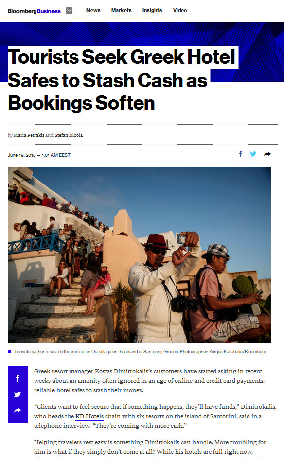 «Οι πελάτες του ξενοδόχου Κώστα Δημητροκάλη έχουν αρχίσει τις τελευταίες εβδομάδες να του θέτουν ένα ερώτημα, το οποίο δεν είχε ακούσει εδώ και πολλά χρόνια: Αν υπάρχουν ασφαλή χρηματοκιβώτια στο ξενοδοχείο του για να βάλουν τα χρήματά τους…» Αυτό αναφέρει σε σημερινό δημοσίευμά του το Bloomberg, καταδεικνύοντας την ανησυχία που ισχυρίζεται ότι επικρατεί στους επισκέπτες της χώρας για το ενδεχόμενο ενός πιστωτικού γεγονότος.