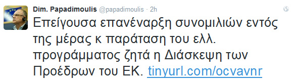 Την επείγουσα επανέναρξη των συνομιλιών εντός της ημέρας για την παράταση του τρέχοντος προγράμματος οικονομικής στήριξης προς την Ελλάδα θα ζητήσει η Διάσκεψη των Προέδρων του Ευρωκοινοβουλίου, σύμφωνα με τα όσα έγραψε στο Twitter ο Δημήτρης Παπαδημούλης.