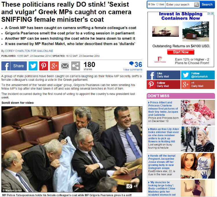 «Ο φακός “έπιασε” σεξιστές και χυδαίους Έλληνες βουλευτές να μυρίζουν το παλτό γυναίκας συναδέλφου τους». Με αυτές τις λέξεις σχολιάζει η βρετανική Daily Mail, σε εκτενές δημοσίευμά της, το περιστατικό που σημειώθηκε στη Βουλή κατά την πρώτη ψηφοφορία για την εκλογή του Προέδρου της Δημοκρατίας.