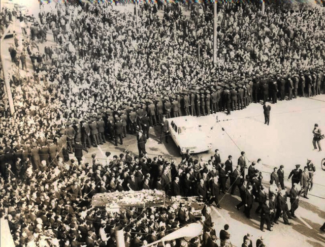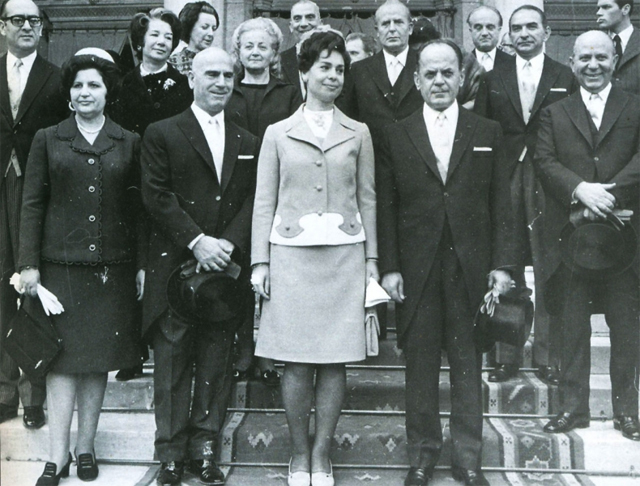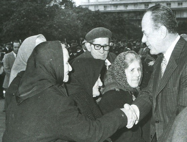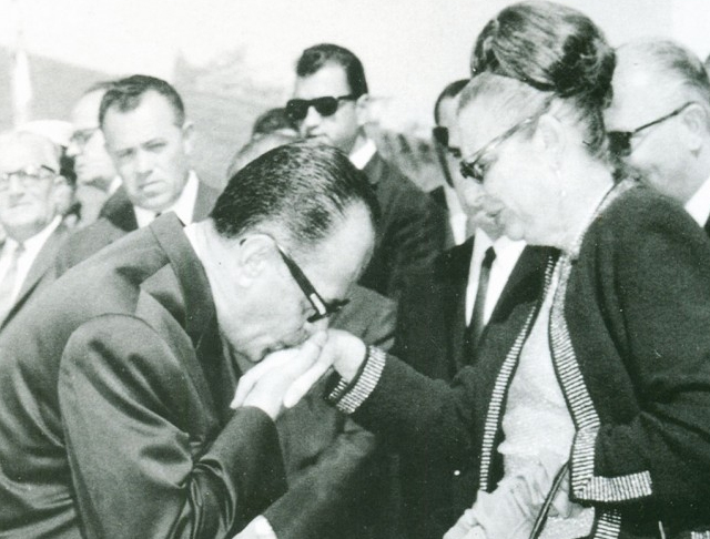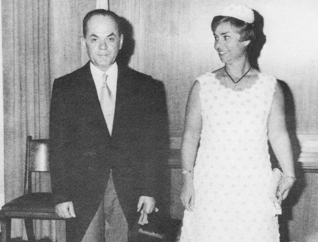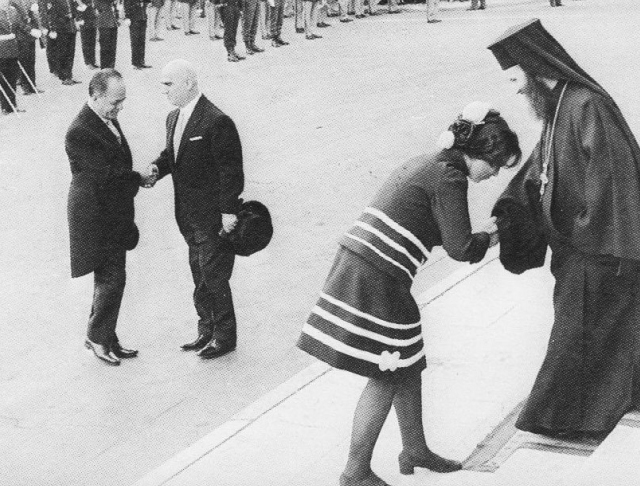 Από την τελετή των αποκαλυπτηρίων του αδριάντα του Ελευθερίου Βενιζέλου. Ο Γ. Παπαδόπουλος υποδέχεται την Κάθλην Σοφ. Βενιζέλου