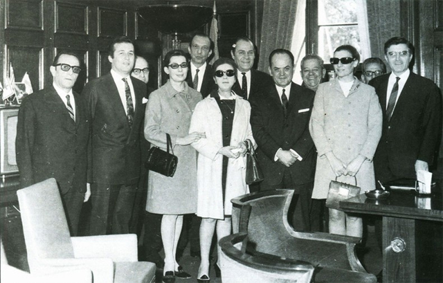 Επίσκεψη ηθοποιών στο γραφείο του δικτάτορα. Διακρίνονται από αριστερά οι Δ. Παπαμιχαήλ, Κ. Μουσούρης, Ελ Χατζηαργΰρη, Αλ. Λειβαδίτης, Μ. Αρώνη, Λ. Κωνσταντάρας, Π. Ζερβός, Μ. Κοντού, Γ. Οικονομίδης