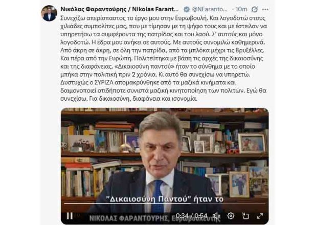 «Συνεχίζω απερίσπαστος το έργο μου στην Ευρωβουλή. Και λογοδοτώ στους χιλιάδες συμπολίτες μας, που με τίμησαν με τη ψήφο τους και με έστειλαν να υπηρετήσω τα συμφέροντα της πατρίδας και του λαού. Σ’ αυτούς και μόνο λογοδοτώ. Η έδρα μου ανήκει σε αυτούς. Με αυτούς συνομιλώ καθημερινά. Από άκρη σε άκρη, σε όλη την πατρίδα, από τα μπλόκα μέχρι τις Βρυξέλλες. Και πέρα από την Ευρώπη. Πολιτεύτηκα με βάση τις αρχές της δικαιοσύνης και της διαφάνειας», αναφέρει σε ανακοίνωσή του ο κ. Φαραντούρης.