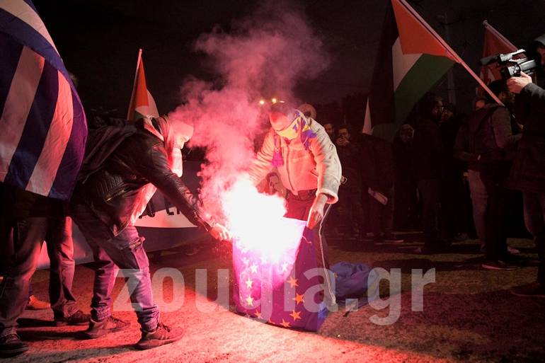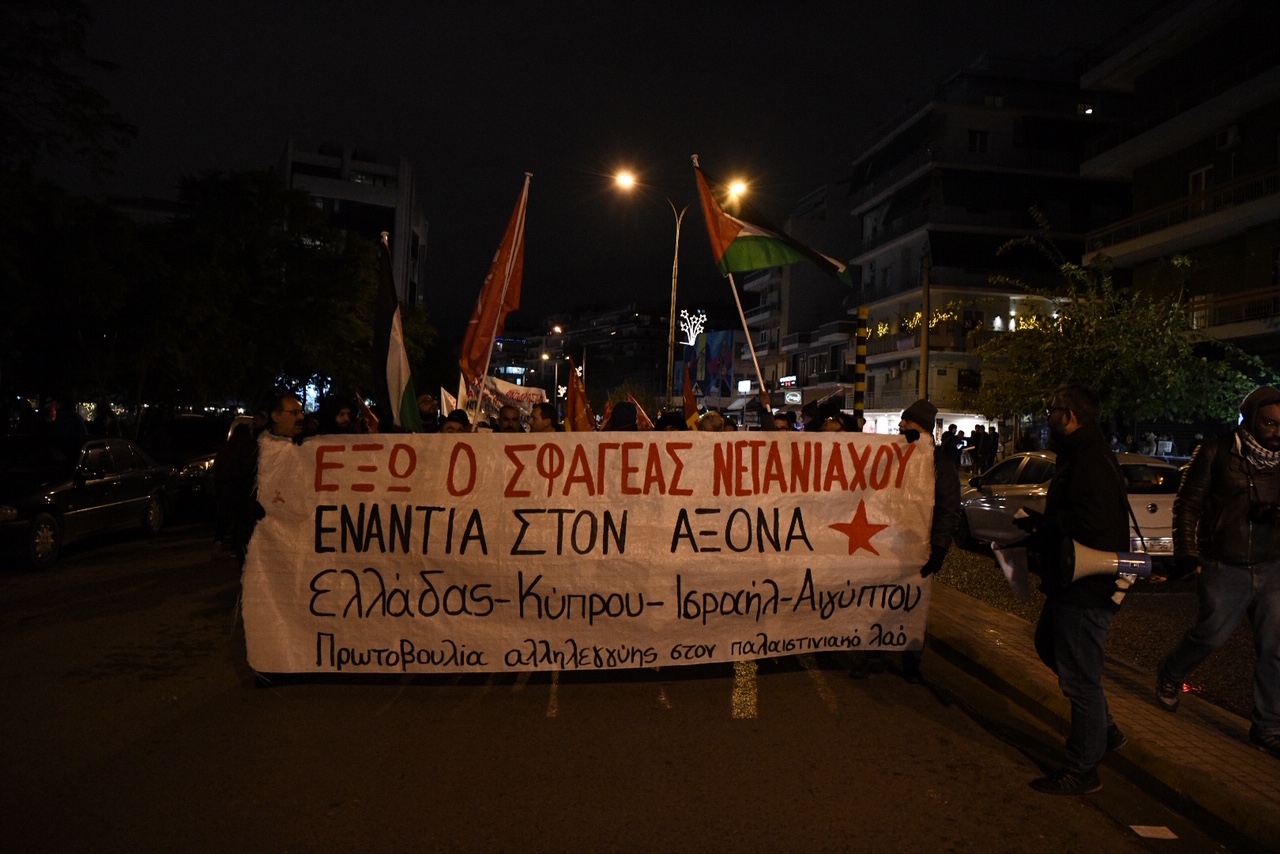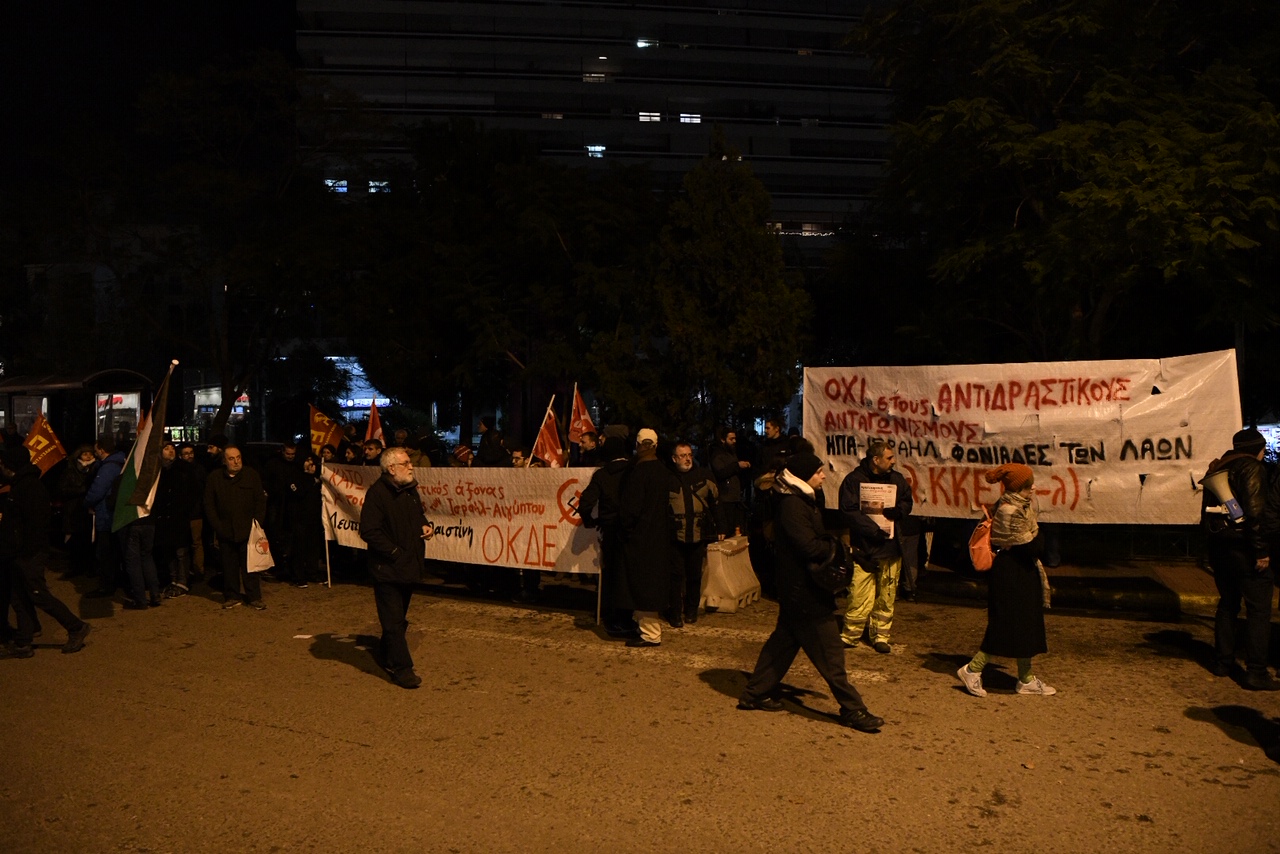 Περίπου 100 -150 άτομα κυρίως Παλαιστίνιοι που διαμένουν στην Ελλάδα αλλά και μέλη διαφόρων αριστερών οργανώσεων διαδήλωσαν στην οδό Πανόρμου κατά της επίσκεψης του προέδρου του Ισραήλ στην Ελλάδα.