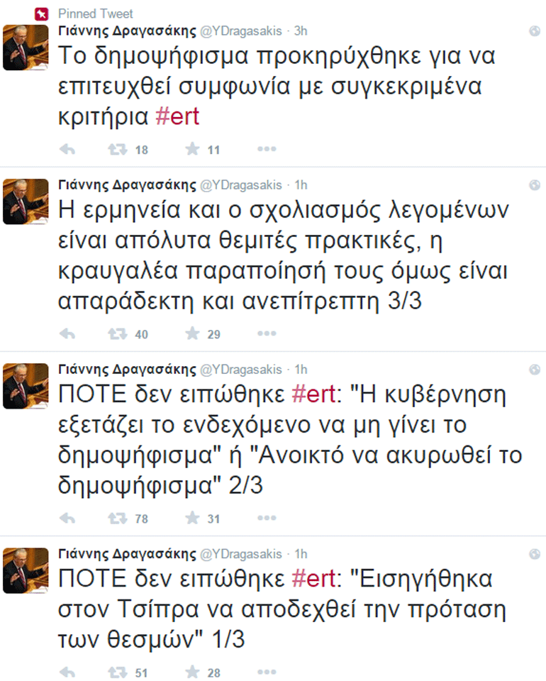 Ο αντιπρόεδρος της κυβέρνησης Γιάννης Δραγασάκης προχώρησε σε διευκρινήσεις μέσω twitter στα περί πιθανότητας να ματαιωθεί το δημοψήφισμα.