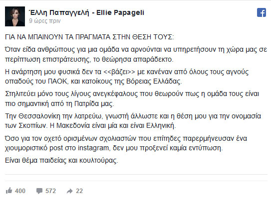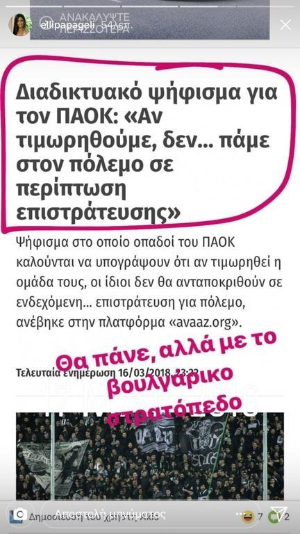 Υπενθυμίζεται ότι η Αγγελική-Έλλη Παπαγγελή είχε ανεβάσει στο Instagram μια φωτογραφία από διαδικτυακό ψήφισμα οπαδών του Δικεφάλου, με τίτλο: «Αν τιμωρηθούμε, δεν… πάμε στον πόλεμο σε περίπτωση επιστράτευσης», με την ίδια να σχολιάζει: «Θα πάνε, αλλά με το βουλγαρικό στρατόπεδο».