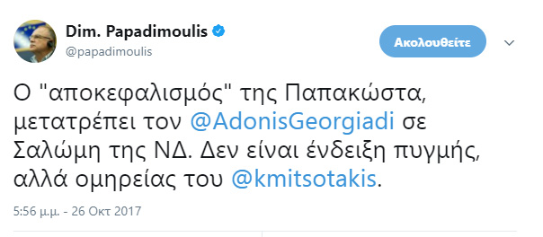 «Ο “αποκεφαλισμός” της Παπακώστα, μετατρέπει τον Άδωνη Γεωργιάδη σε “Σαλώμη της ΝΔ”. Δεν είναι ένδειξη πυγμής, αλλά ομηρείας του Κυριάκου Μητσοτάκη»