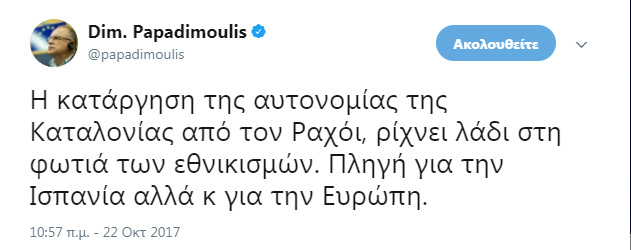 Τις ανακοινώσεις του Ισπανού πρωθυπουργού αναφορικά με την ενεργοποίηση του άρθρου 155 που αναστέλλει την ανεξαρτησία της Καταλονίας, σχολιάζει με ανάρτηση του στο Twitter, ο αντιπρόεδρος του Ευρωπαϊκού Κοινοβουλίου και επικεφαλής της ευρωομάδας του ΣΥΡΙΖΑ Δημήτρης Παπαδημούλης, κάνοντας λόγο για πληγή στην Ισπανία και στην Ευρώπη.