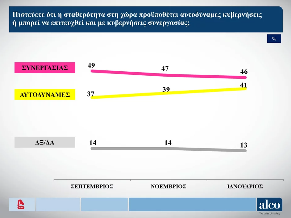 Ένα από τα ερωτήματα της έρευνας αφορά στο αν οι πολίτες προτιμούν μια αυτοδύναμη κυβέρνηση ή μια κυβέρνηση συνεργασίας. Στο δίλημμα αυτό, το 46% απάντησε υπέρ της συνεργασίας, ενώ το 41% (από 37%) τάχθηκε υπέρ της αυτοδύναμης κυβέρνησης. Αξιοσημείωτο, ωστόσο, είναι ότι όσο πλησιάζουμε προς τις εκλογές αυξάνονται τα ποσοστά όσων επιθυμούν αυτοδυναμία.
