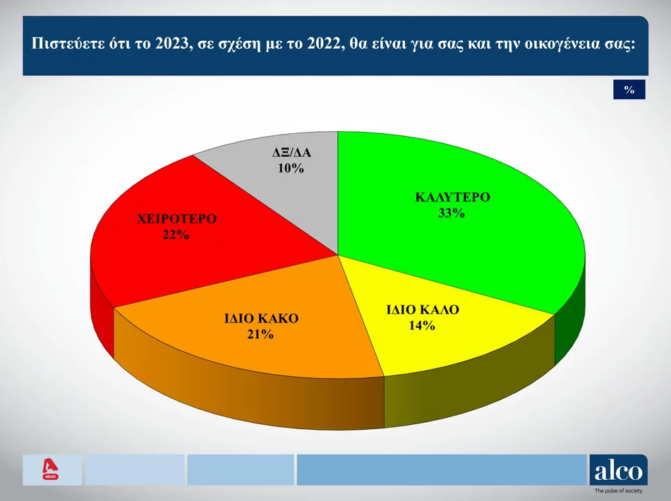 Στο ερώτημα αν θεωρούν ότι το 2023 θα είναι καλύτερο για τις οικογένειες από το 2022, το 47% των πολιτών απάντησε πως θα είναι καλύτερα τα πράγματα ή το ίδιο καλά.