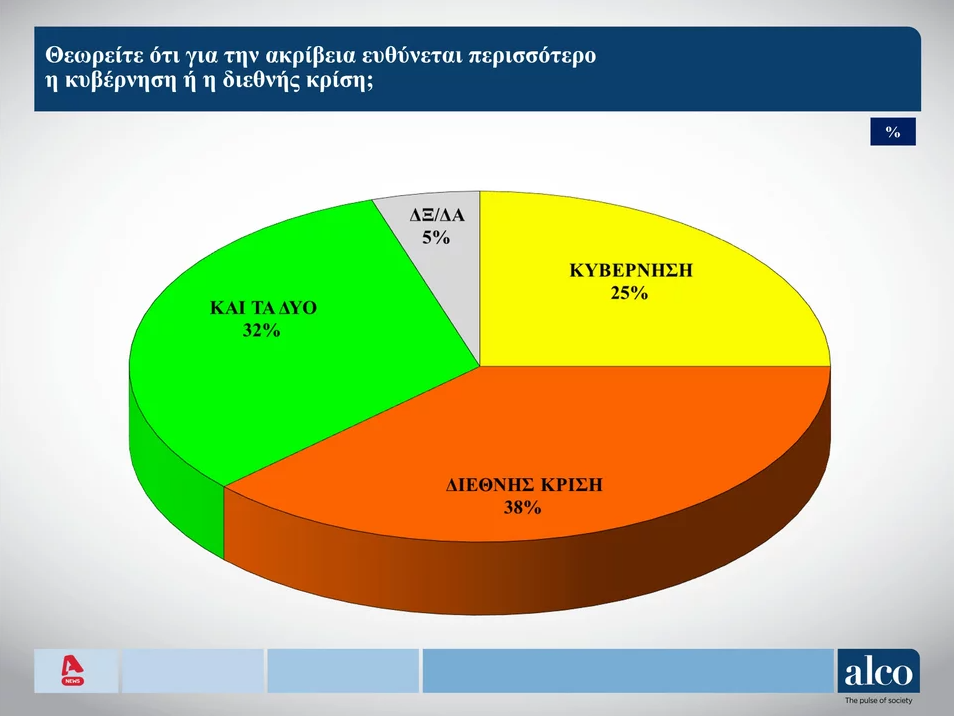 Για την ακρίβεια ευθύνεται η διεθνής κρίση λέει το 38%, έναντι του 25% που απαντά η κυβέρνηση και 32% που εκτιμά ότι ευθύνονται και οι δύο.