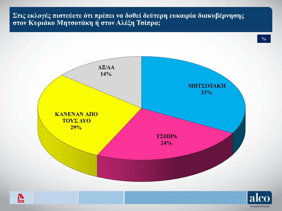 Το 33% των πολιτών έδειξε πως θα προτιμούσε να δώσει μία δεύτερη ευκαιρία διακυβέρνησης στον Κυριάκο Μητσοτάκη και το 24% υπέρ Τσίπρα, ενώ το 29% λέει κανένας από τους δύο.