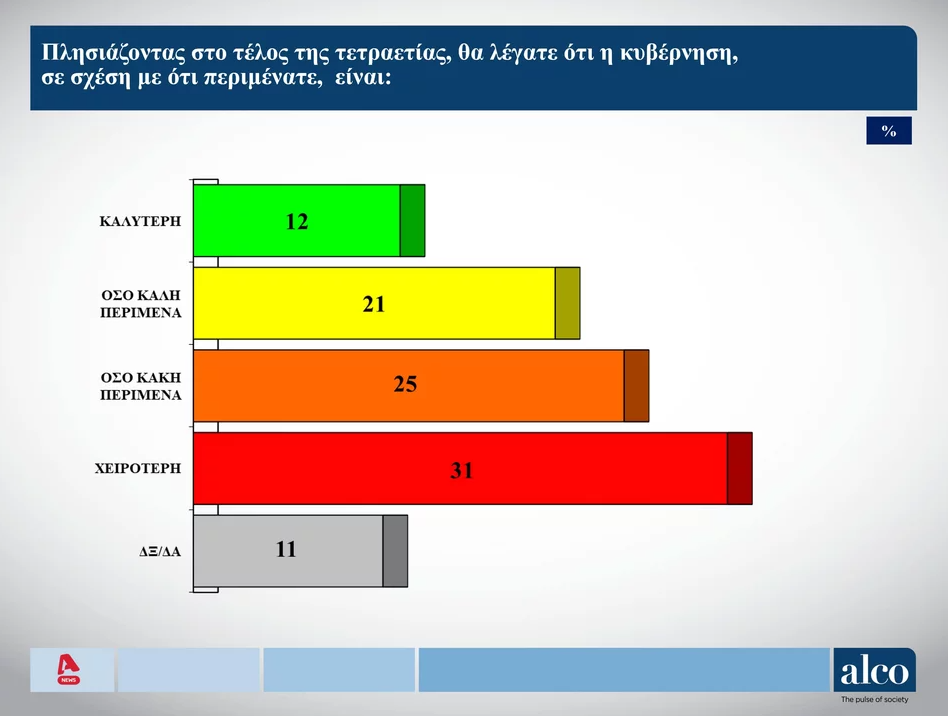 Στην ερώτηση πώς ήταν η κυβέρνηση σε σχέση με αυτό που περίμεναν οι πολίτες, η επικρατέστερη απάντηση κατά 31% ήταν η επιλογή «χειρότερη». «Καλύτερη» απάντησε μόνο το 12%, «όσο καλή περίμενα» απάντησε το 21%, ενώ «όσο κακή περίμενα» απάντησε το 25%.