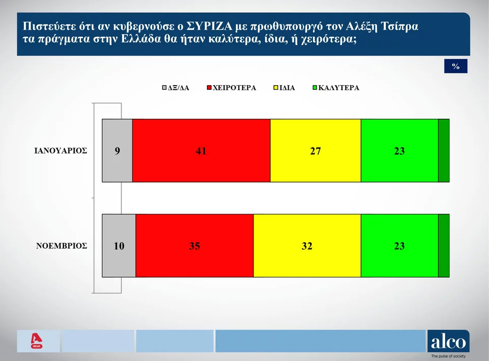 Στην ερώτηση αν τα πράγματα θα ήταν καλύτερα με ΣΥΡΙΖΑ στην κυβέρνηση, το 41% απάντησε πως θα ήταν χειρότερα, ενώ το 27% αναφέρει τα ίδια.  Καλύτερα ψήφισε το 23%.