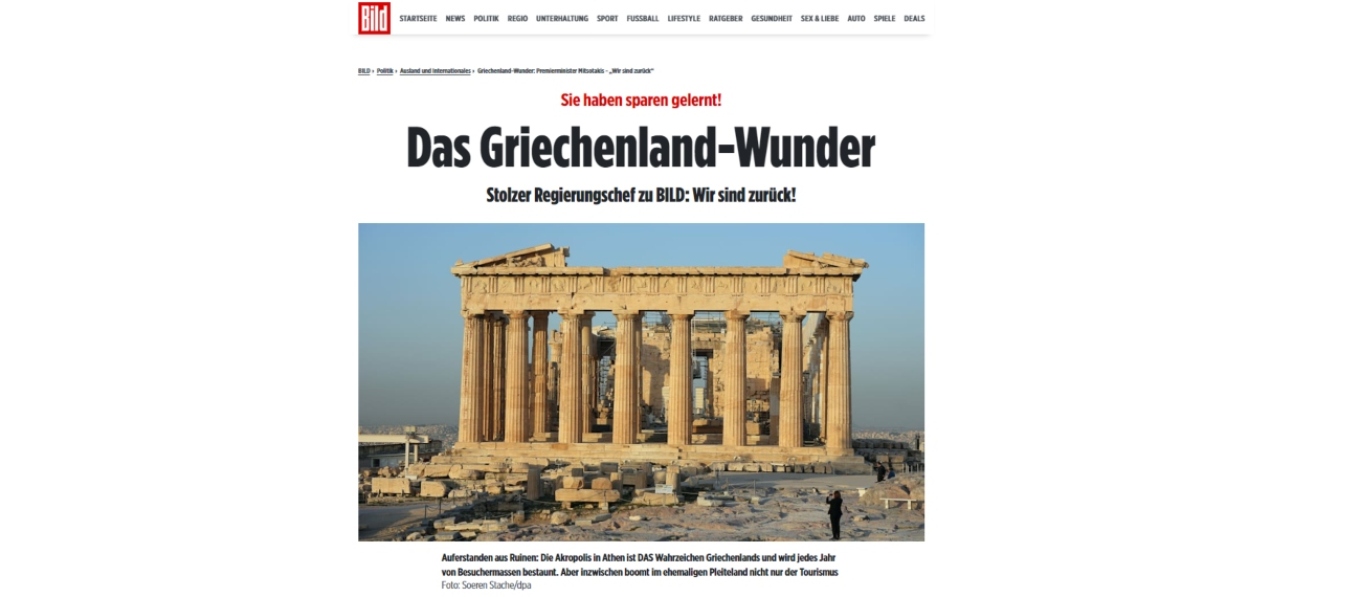 Ένα διθυραμβικό δημοσίευμα για τη δυναμική επάνοδο της Ελλάδας μετά την κρίση χρέους της περασμένης δεκαετίας δημοσίευσε η άλλοτε έντονα επικριτική γερμανική εφημερίδα Bild, με τίτλους όπως «Το ελληνικό γαλανόλευκο θαύμα», ενώ φιλοξενεί και συνέντευξη του πρωθυπουργού Κυριάκου Μητσοτάκη.